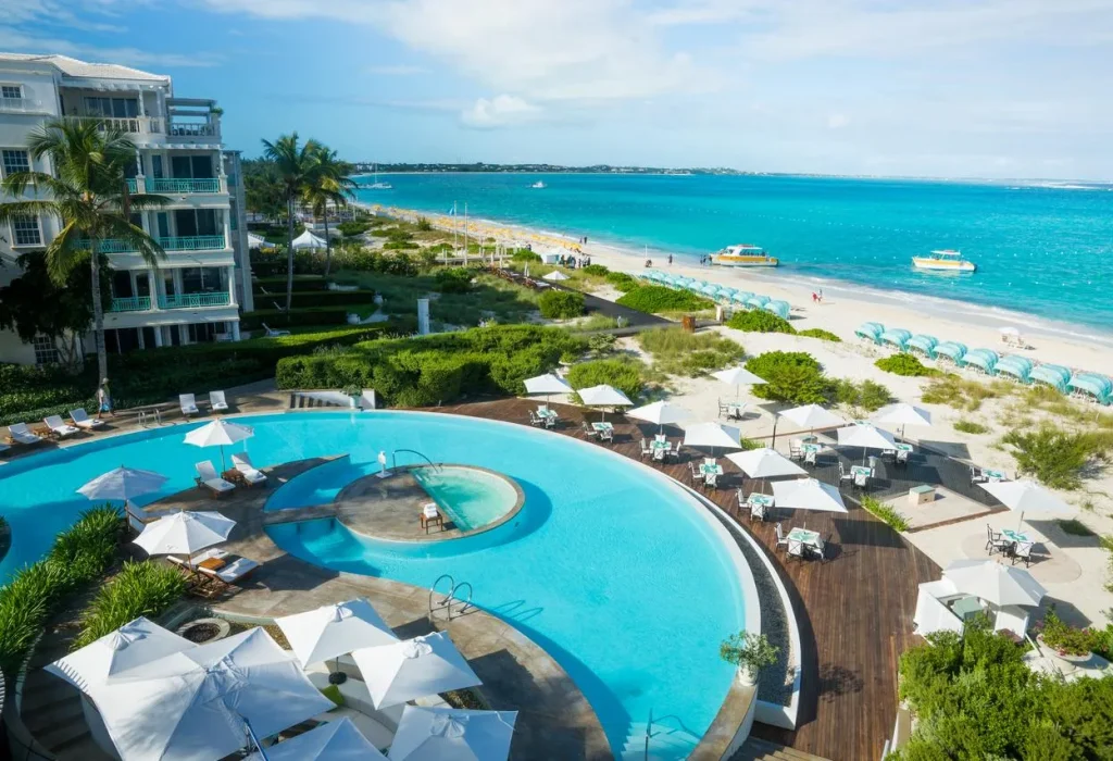 The Palms en las Islas Turcas y Caicos es uno de los hoteles para bodas en el Caribe que destaca por su elegancia y privacidad. Con ceremonias en la playa privada, decoraciones personalizadas y un servicio impecable, este hotel es perfecto para una boda de lujo junto al mar.